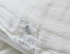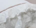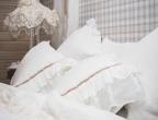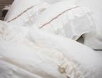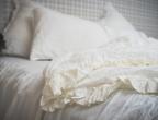 Bedding set PARIS is creamy and romantic. This milky-white set is decorated with generous amounts of ruffle and antiqued velvet ribbon. This bedding set is made from 100% natural linen fabric. Linen is the healthiest choice of fabric for your bedroom thanks to its anti-microbial qualities. The duvet cover is from a lightweight fabric and the flat sheet from a more durable and thicker material. These products won’t shrink in the wash thanks to a special treatment-wash. The material is silky-soft to the touch and does not need ironing, linen’s wrinkles are a part of it’s natural charm.