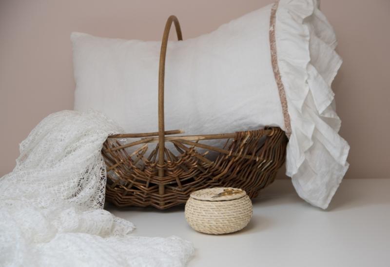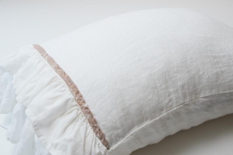 Pillowcase PARIS is creamy and romantic. This milky-white set is decorated with generous amounts of ruffle and antiqued velvet ribbon. This is made from 100% natural linen fabric. Linen is the healthiest choice of fabric for your bedroom thanks to its anti-microbial qualities. Pillowcase won’t shrink in the wash thanks to a special treatment-wash. The material is silky-soft tothe touch and does not need ironing, linen’s wrinkles are a part of it’s natural charm