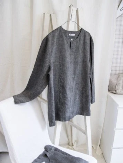 Käsitööna valmistatud, linasest kangast ja kivipestud erilise pehmuse saavutamiseks. Linane kangas kaitseb nahka päikese eest ja laseb nahal hingata. Sellel tuunikal pole kinnitusi. Esiosa on parema hoidmise tagamiseks valmistatud kahekihilises kangast ja ees all ääres on lõhik.