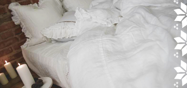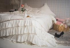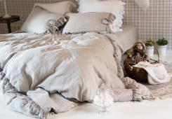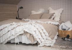 выполнены из 100 % льна отличного качества. Бельё предварительно простирано в специальной технике, благодаря чему ткань стала мягкой, бархатистой на ощупь. Изделия не дают усадки и практически не нуждаются в галжении. Приятная винтажная потертость ткани добавляет ощущение уюта и тепла. В отделке использованы кружева, бархатные ленты, шнуры и канты.