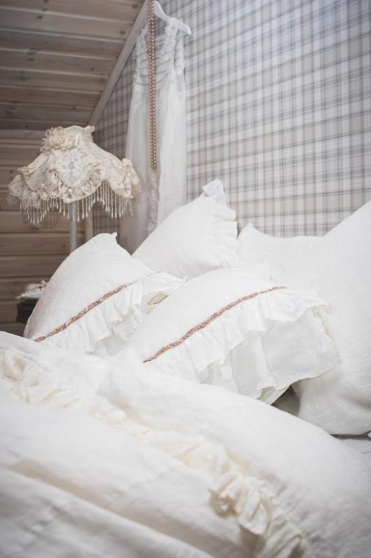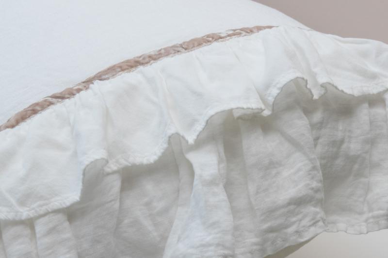 Романтический комплект молочно-белого цвета. Пододеяльник с обилием рюш и бархатнои лентой. Наволочка с двойными рюшами и тоже отделана винтажной бархатной лентой.