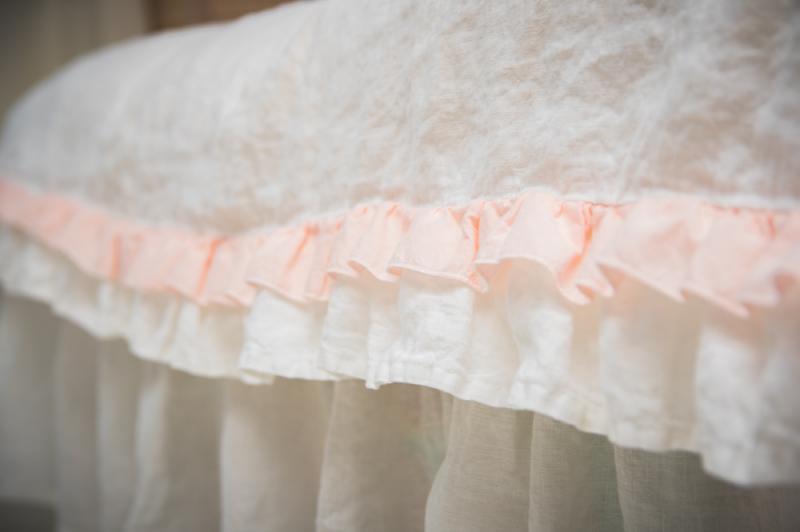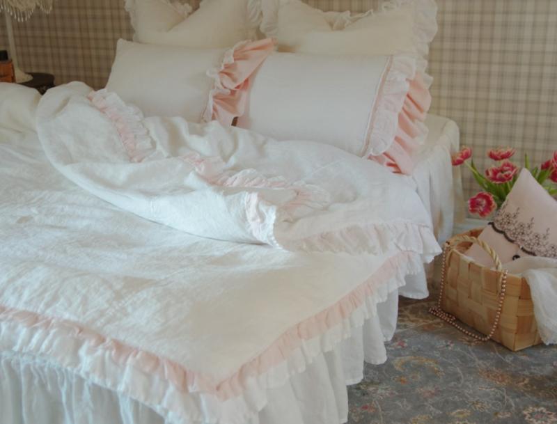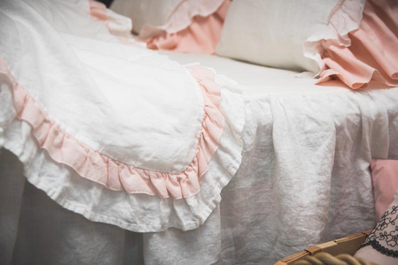 Натурально белый Пододеяльник с бледно-розовым рюшем из хлопка, выполнен  из 100% льняной ткани, великолепного качества.  Изделие не даёт усадки после стирки, т.к. предварительно простирано в специальной технике благодаря чему ткань стала очень мягкой и бархатистой на ощупь, практически не нуждается в глажении.