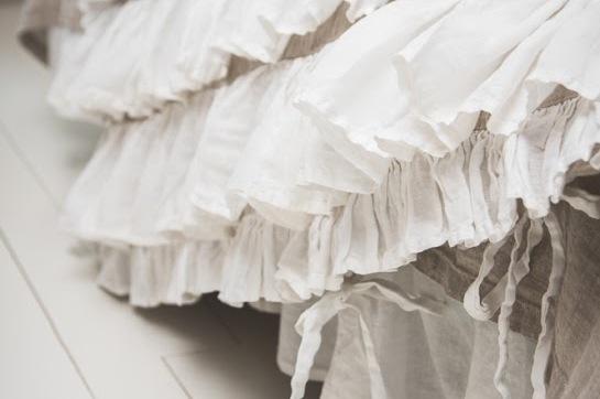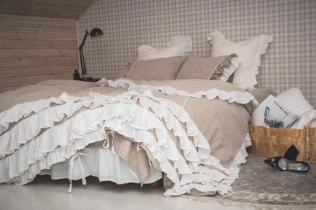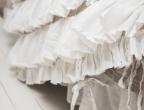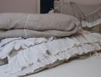 Богато декорированнный пододеяльник: рюши, завязки, тесьма. Сочетания белого и натурально- серого цветов вносят нотку акварельности и природной естественности.